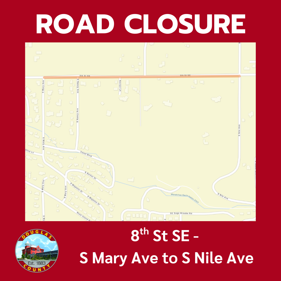 Road closure will begin at 6:00 AM on Monday, February 23, 2026 and end on Monday, June 1, 2026 at 7:00 PM. 8th St SE from S Mary Ave to S Nile Ave will be closed to through traffic.